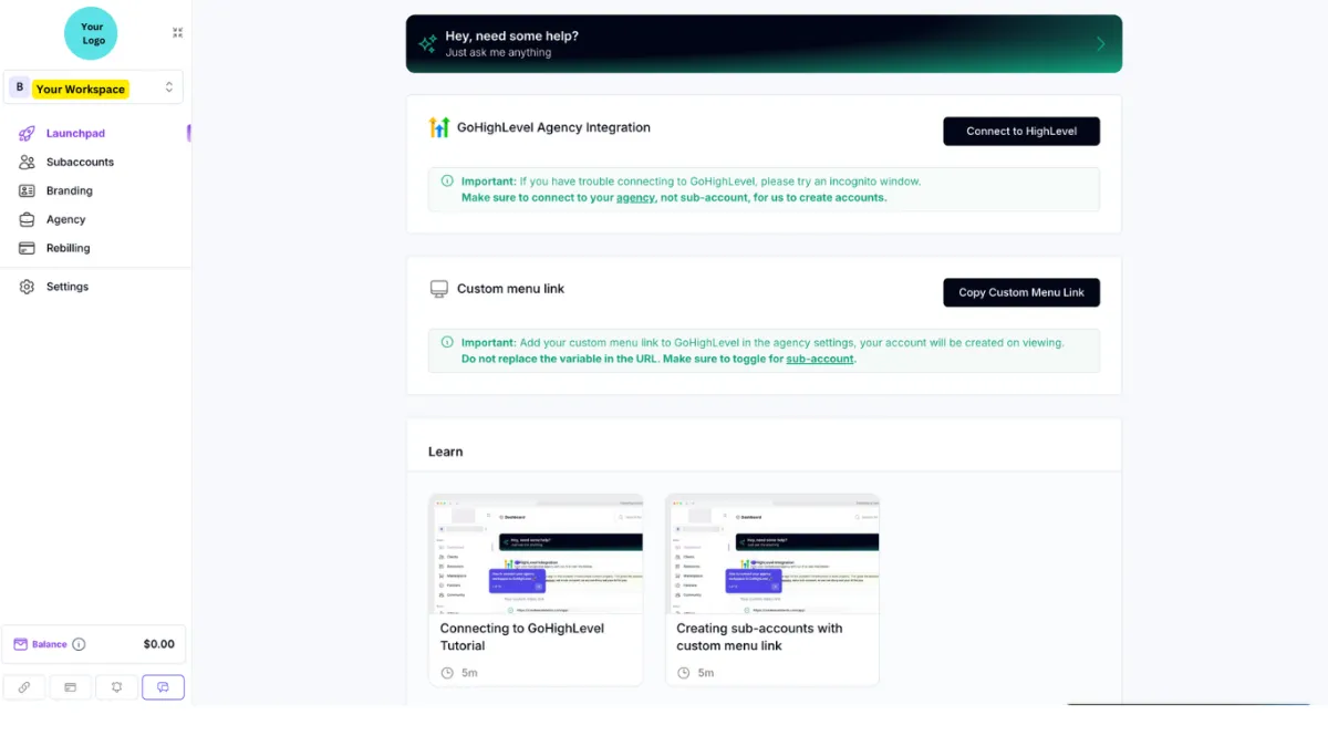Note: You must be one either the $297 or $497 GHL plans to be able to connect to our White Label Agency Dashboard. If you are on the $97 plan, you can still use our software directly in your sub-account but will not be able to utilize the White Label Agency Dashboard or utilize re-billing.